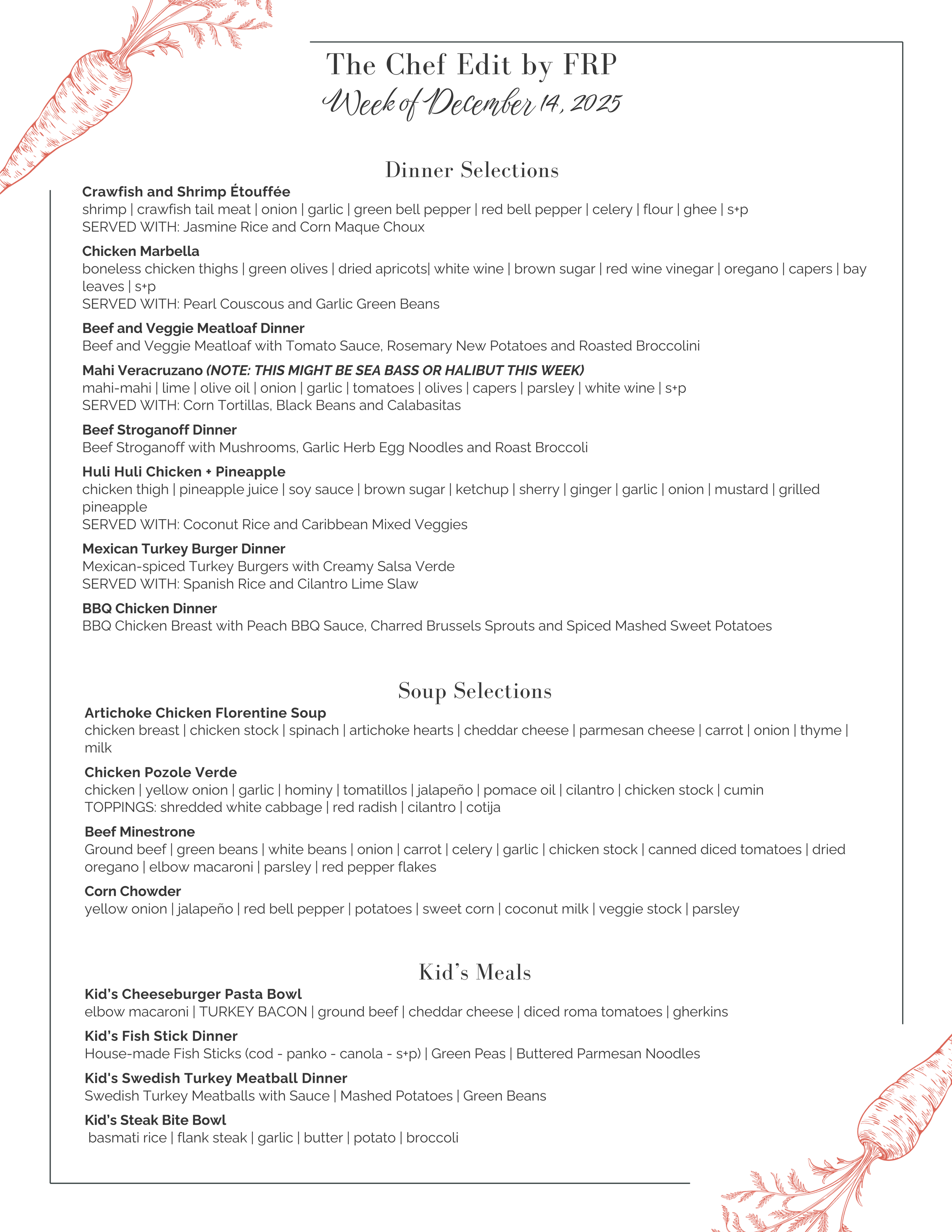 The Chef’s Edit: Weekly Menu Back to Store for 12.14.25 Week of 12.14.25 — printable menus below — Print Menus